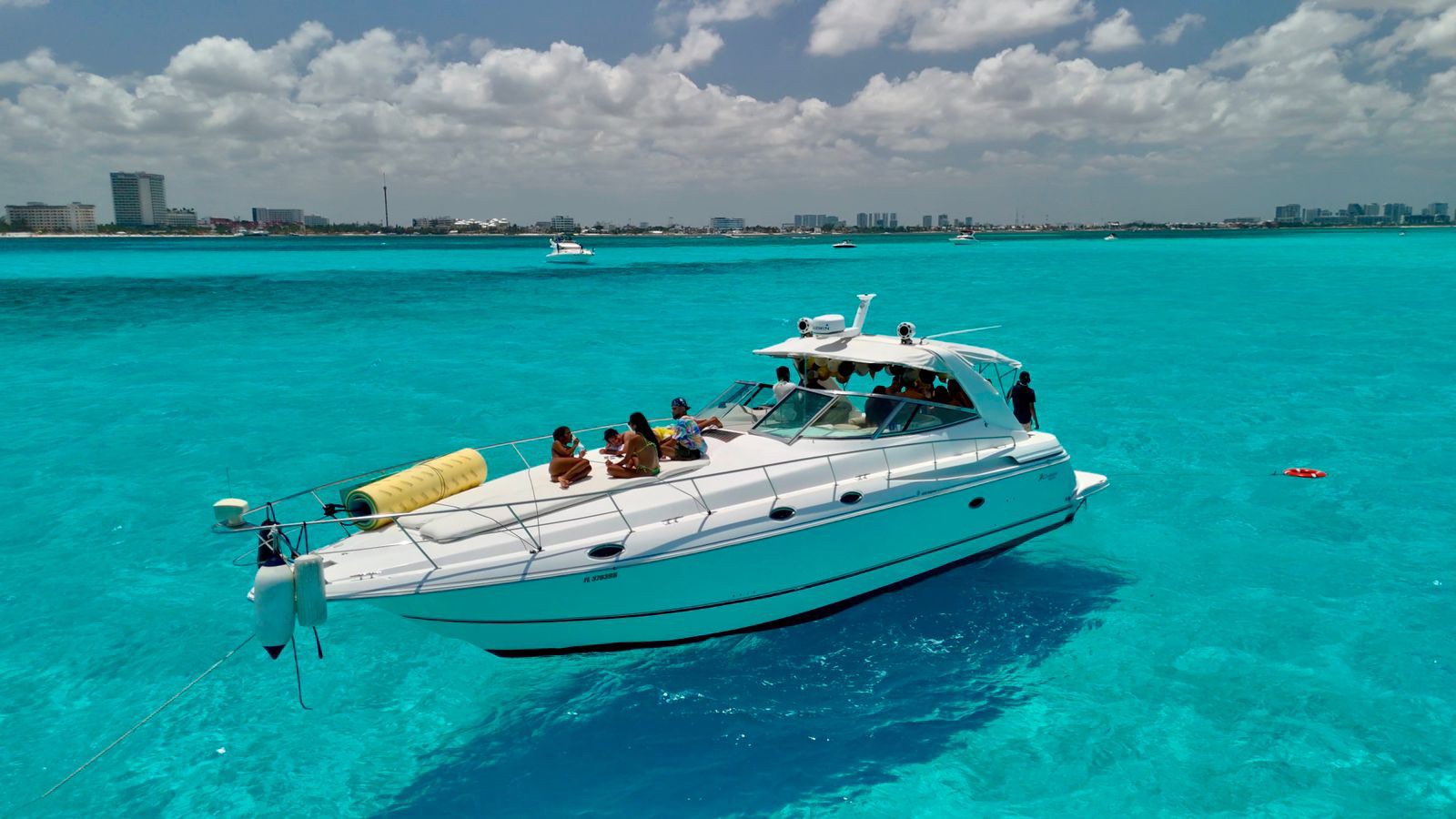 Sea Ray Sundancer 44’ A classic in comfort and design, the Sea Ray Sundancer 44’ is a sleek express cruiser built for day charters and special moments at sea. With a spacious bow, shaded cockpit, and smooth performance, it’s perfect for groups looking to enjoy the Cancún coastline in a premium setting. Includes: Certified captain and 1 crew member Large bow sunbed for sunbathing and relaxing Shaded cockpit with lounge seating and table Integrated swim platform for easy water access Snorkeling gear and floating sea carpet 24 beers, 24 sodas, and 24 bottled waters Fresh towels for all guests 3 bags of ice to keep drinks chilled High-quality Bluetooth sound system Whether you're planning a celebration, family outing, or just a stylish day on the water, the Sundancer 44’ offers the right mix of layout, space, and luxury for a seamless experience.