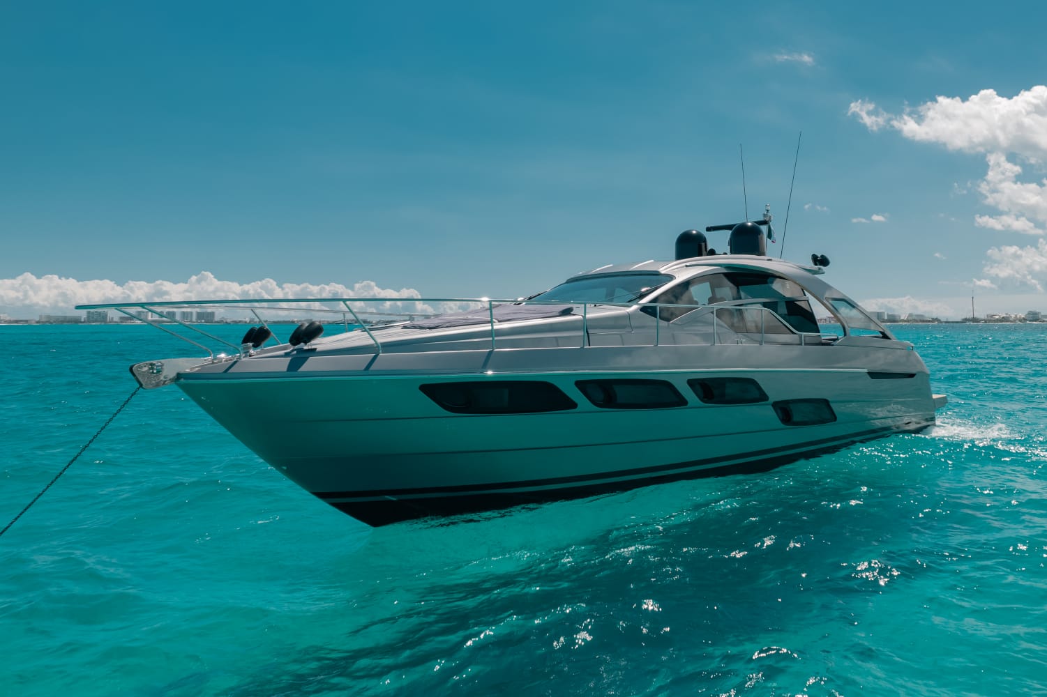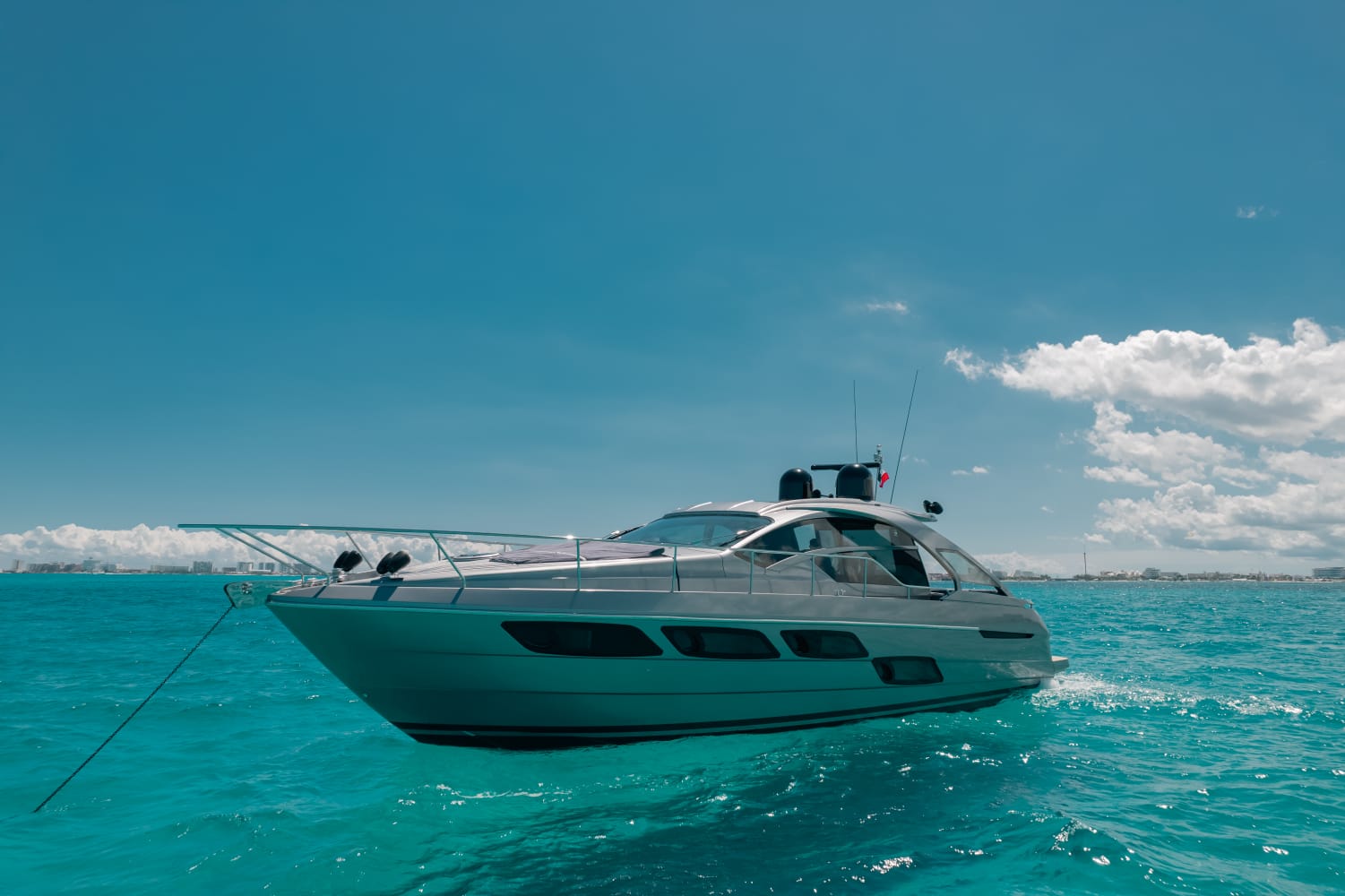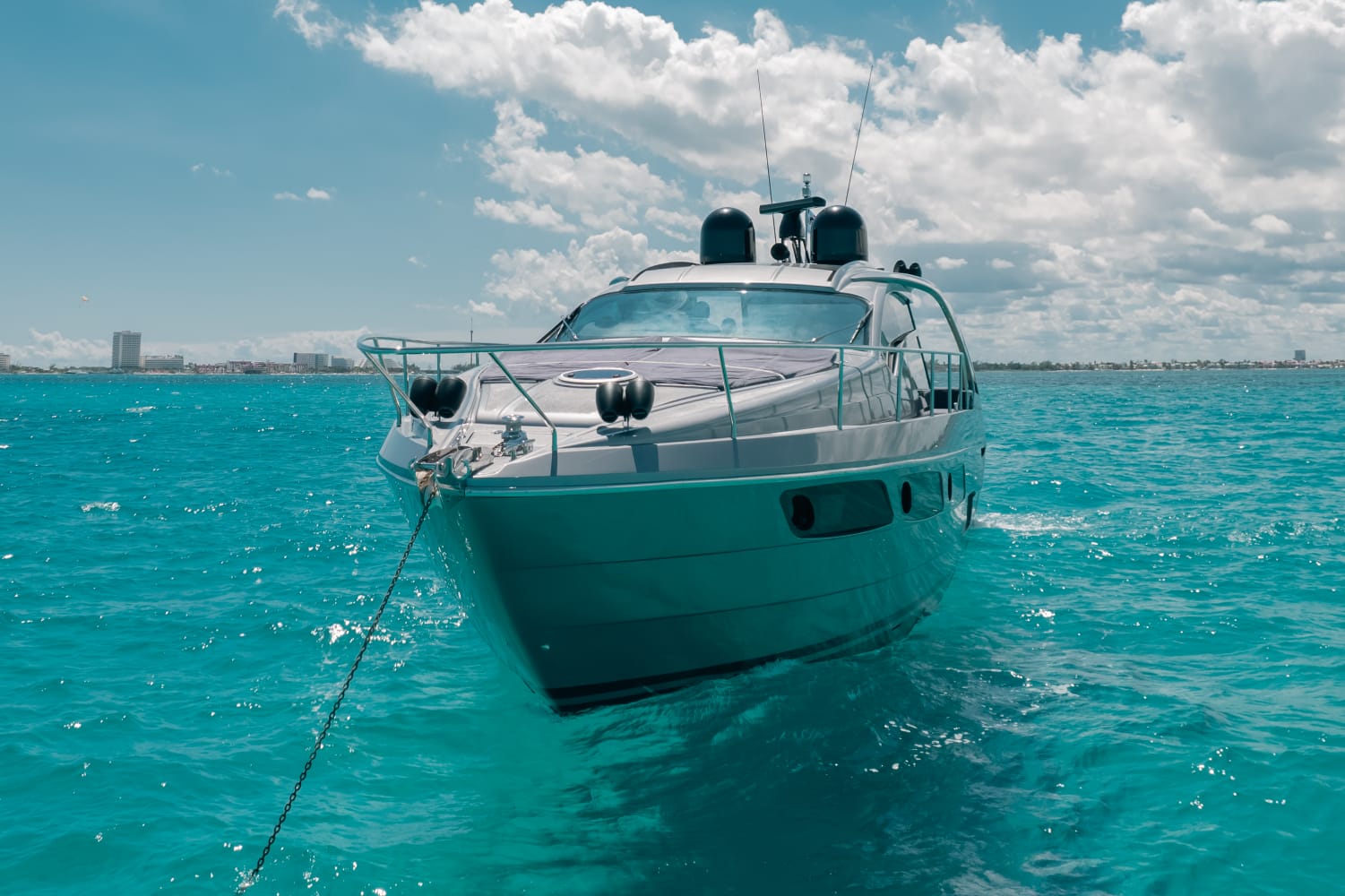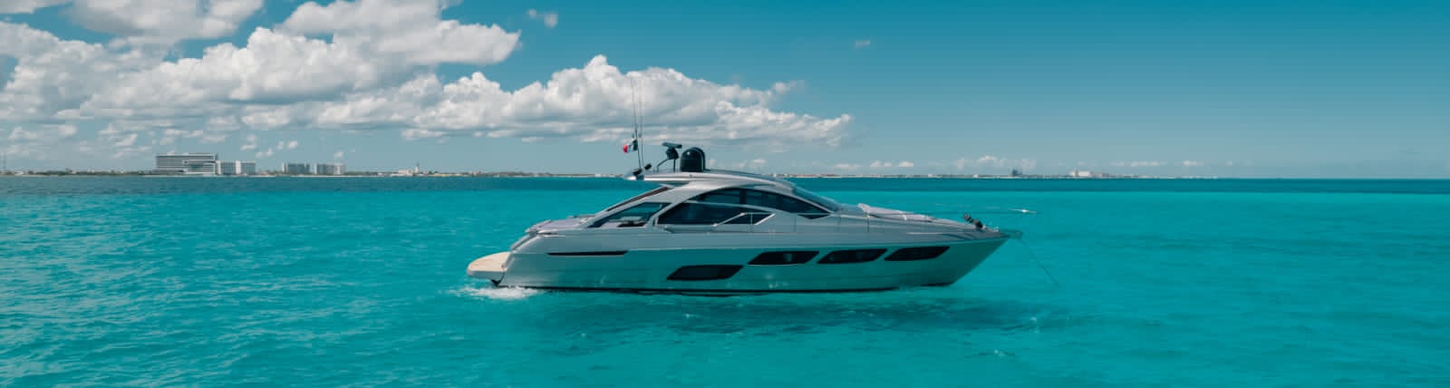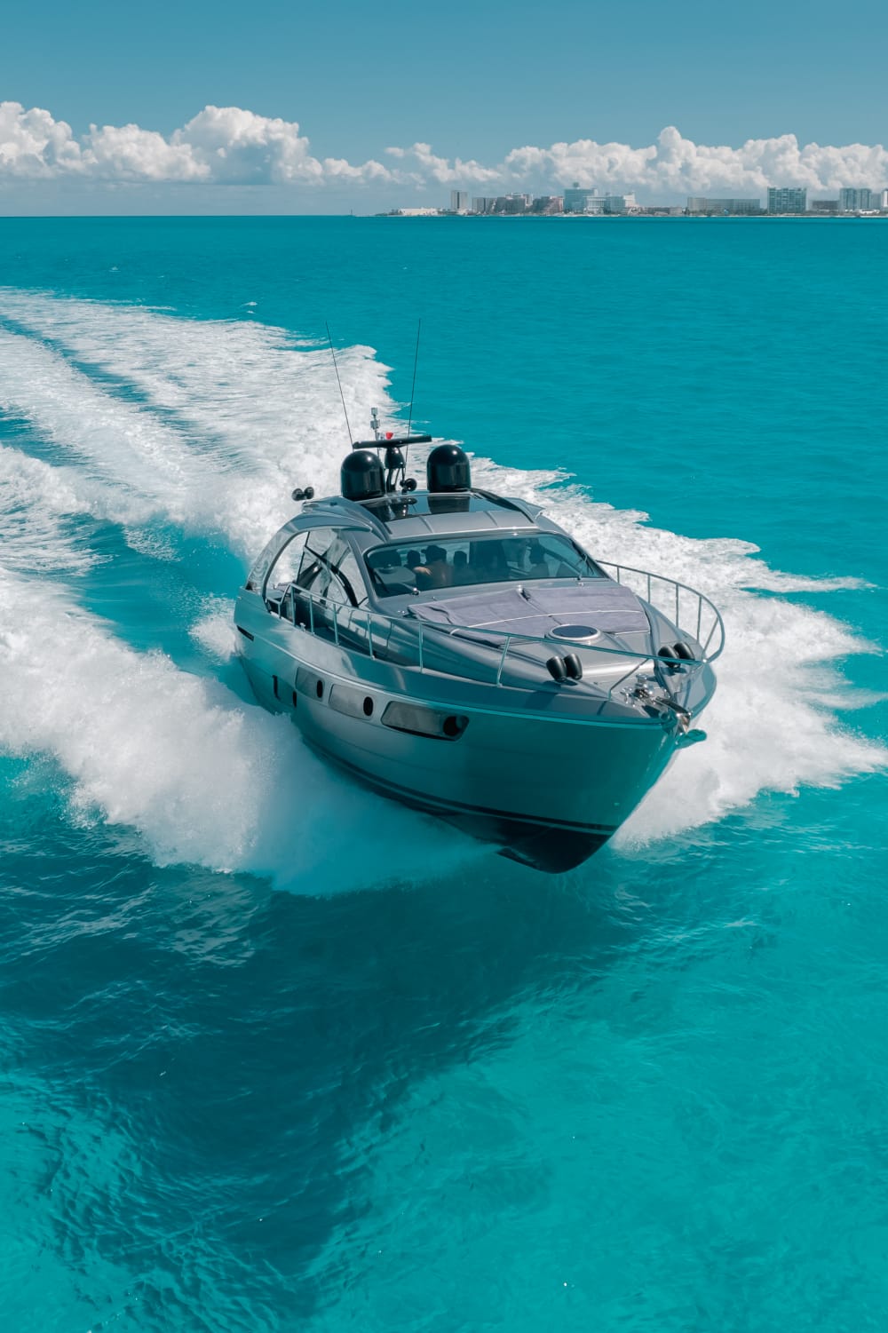 Kantenah – Pershing 5X 56’ – 2019 📍 Max capacity: 12 guests The Kantenah Pershing 5X 56’ is a sleek Italian sport yacht that combines cutting-edge performance with refined comfort. Perfect for stylish day charters, it offers spacious lounging areas, modern interiors, and a dynamic cruising experience along Cancún and Isla Mujeres. 🛋️ Layout & Features: – 2 cabins with comfortable berths – 2 full bathrooms – Interior salon with lounge and dining area – 2 dining spaces (interior & exterior) – Forward and aft sundecks for sunbathing – Air conditioning throughout – TV and Bluetooth premium sound system 🧊 Full-Day Experience Includes: – Professional captain and crew – Snorkeling gear and life vests – Towels and dry snacks – 24 bottled waters, 24 soft drinks, 24 beers – 1 bag of ice per hour Sporty, modern, and luxurious, the Kantenah Pershing 5X 56’ is ideal for those seeking an exhilarating yet comfortable charter—whether relaxing on the sundecks, exploring Isla Mujeres, or cruising the turquoise Caribbean waters in style.