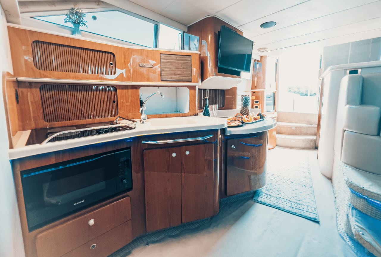 Sea Ray 50’ Flybridge The Sea Ray 50’ Flybridge delivers the ideal blend of power, comfort, and panoramic views. With spacious multi-level lounging areas and a smooth cruising experience, it's perfect for families or groups seeking a refined day on the water. Includes: Professional captain and 2 crew members Expansive flybridge with shaded seating and sea views Bow sunbed and rear deck dining area Snorkeling gear and floating sea carpet 24 beers, 24 sodas, and 24 bottled waters Fresh towels for all guests 4 bags of ice to keep drinks chilled Premium sound system with Bluetooth Whether you're celebrating a special occasion or just want to unwind with friends, the Sea Ray 50’ Flybridge offers a versatile and stylish escape at sea. ‍